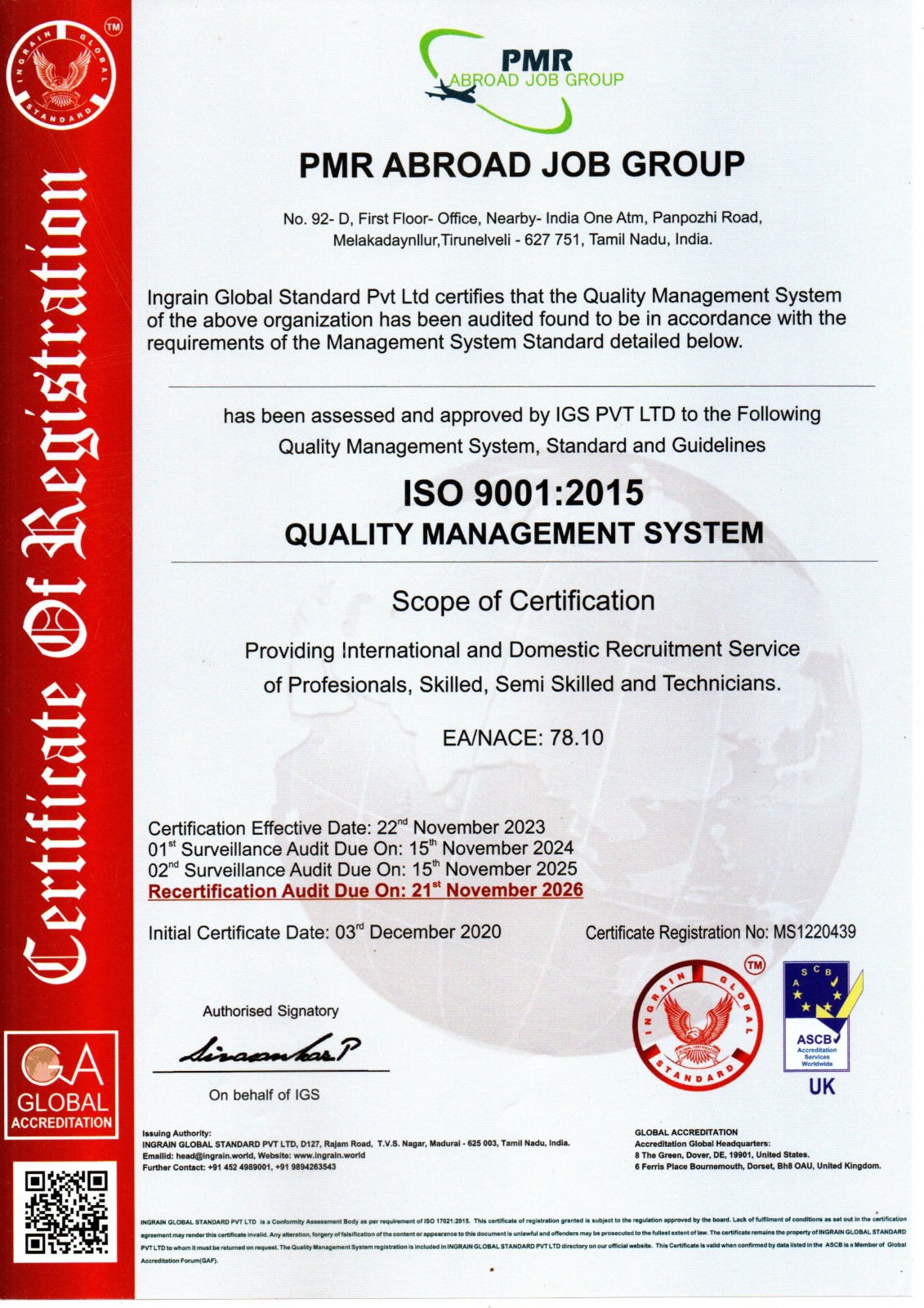 Welcome to PMR ABROAD JOB GROUP, a leading professional manpower solutions provider based in Kadayanallur, Tenkasi, India. With over 15 years of expertise in the recruitment industry and a decade of successful operations. PMR IS an ISO Certified 9001: 2015, Government Approved & Recognized Overseas Recruitment Agency, was founded by Mr. PALANI, who is also the Managing Director of the Company. we have established ourselves as a trusted partner in connecting skilled talent with reputable global organizations.
