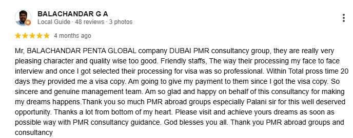 Mr, BALACHANDAR PENTA GLOBAL company DUBAI PMR consultancy group, they are really very pleasing character and quality wise too good. Friendly staffs, The way their processing my face to face interview and once I got selected their processing for visa was so professional. Within Total pross time 20 days they provided me a visa copy. Am going to give my payment to them since I got the visa copy. So sincere and genuine management team. Am so glad and happy on behalf of this consultancy for making my dreams happens.Thank you so much PMR abroad groups especially Palani sir for this well deserved opportunity. Thanks a lot from bottom of my heart. Please visit and achieve yours dreams as soon as possible way with PMR consultancy guidance. God blesses you all. Thank you PMR abroad groups and consultancy