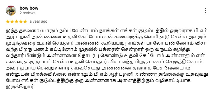 இந்த தகவலை யாரும் நம்ப வேண்டாம் நாங்கள் எங்கள் குடும்பத்தில் ஒருவராக பி எம் ஆர் பழனி அண்ணனை உதவி கேட்டோம் என் கணவருக்கு வெளிநாடு செல்ல அவரும் முடிந்தவரை உதவி செய்தார் அண்ணன் கூறியபடி நாங்கள் பாலோ பண்ணோம் விசா வந்த பிறகு பணம் கட்டினோம் முதலில் பக்ரைன் சென்றார் ஒரு வருடம் கழித்து வந்தார் மீண்டும் அண்ணனை தொடர்பு கொண்டு உதவி கேட்டோம் அண்ணனும் என் கணவருக்கு துபாய் செல்ல உதவி செய்தார் விசா வந்த பிறகு பணம் செலுத்தினோம் அவர் துபாய் சென்றுள்ளார் தயவுசெய்து அண்ணனை தவறாக பேச வேண்டாம் என்னுடன் பிறக்கவில்லை என்றாலும் பி எம் ஆர் பழனி அண்ணா தங்கைக்கு உதவுவது போல எங்கள் குடும்பத்திற்கு ஒரு அண்ணனாக அனைத்திற்கும் வழிகாட்டியாக இருக்கிறார்