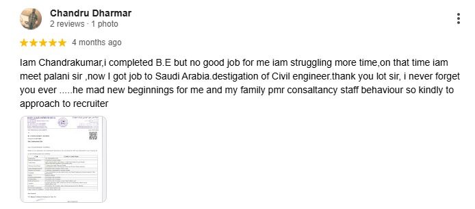 Iam Chandrakumar,i completed B.E but no good job for me iam struggling more time,on that time iam meet palani sir ,now I got job to Saudi Arabia.destigation of Civil engineer.thank you lot sir, i never forget you ever .....he mad new beginnings for me and my family pmr consaltancy staff behaviour so kindly to approach to recruiter