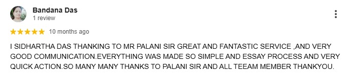I SIDHARTHA DAS THANKING TO MR PALANI SIR GREAT AND FANTASTIC SERVICE ,AND VERY GOOD COMMUNICATION.EVERYTHING WAS MADE SO SIMPLE AND ESSAY PROCESS AND VERY QUICK ACTION.SO MANY MANY THANKS TO PALANI SIR AND ALL TEEAM MEMBER THANKYOU.