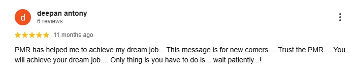 PMR has helped me to achieve my dream job... This message is for new comers.... Trust the PMR.... You will achieve your dream job.... Only thing is you have to do is....wait patiently...!