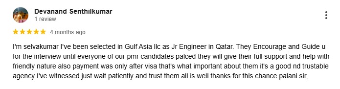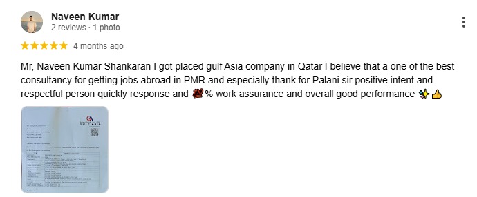 Mr, Naveen Kumar Shankaran I got placed gulf Asia company in Qatar I believe that a one of the best consultancy for getting jobs abroad in PMR and especially thank for Palani sir positive intent and respectful person quickly response and ?% work assurance and overall good performance ✨?