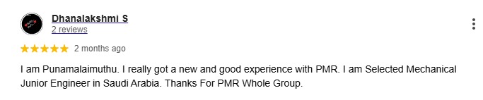 I am Punamalaimuthu. I really got a new and good experience with PMR. I am Selected Mechanical Junior Engineer in Saudi Arabia. Thanks For PMR Whole Group.