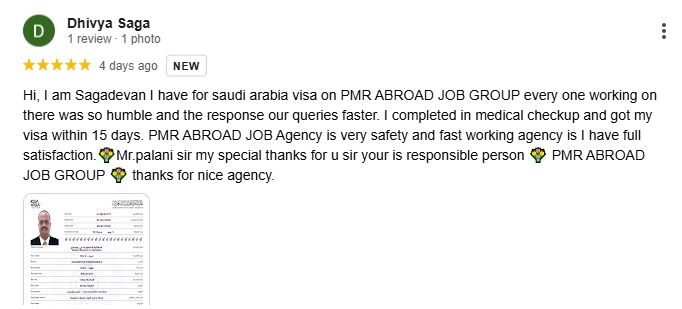 Hi, I am Sagadevan I have for saudi arabia visa on PMR ABROAD JOB GROUP every one working on there was so humble and the response our queries faster. I completed in medical checkup and got my visa within 15 days. PMR ABROAD JOB Agency is very safety and fast working agency is I have full satisfaction.?Mr.palani sir my special thanks for u sir your is responsible person ? PMR ABROAD JOB GROUP ? thanks for nice agency.