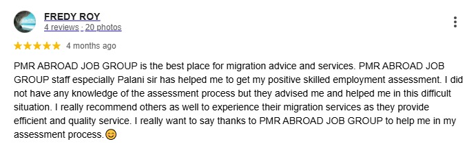 PMR ABROAD JOB GROUP is the best place for migration advice and services. PMR ABROAD JOB GROUP staff especially Palani sir has helped me to get my positive skilled employment assessment. I did not have any knowledge of the assessment process but they advised me and helped me in this difficult situation. I really recommend others as well to experience their migration services as they provide efficient and quality service. I really want to say thanks to PMR ABROAD JOB GROUP to help me in my assessment process.?