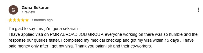 I'm glad to say this , i'm guna sekaran . I have applied visa on PMR ABROAD JOB GROUP. everyone working on there was so humble and the response our queries faster. I completed my medical checkup and got my visa within 15 days . I have paid money only after I got my visa. Thank you palani sir and their co-workers.