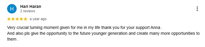 Very crucial turning moment given for me in my life thank you for your support Anna . And also pls give the opportunity to the future younger generation and create many more opportunities to them .