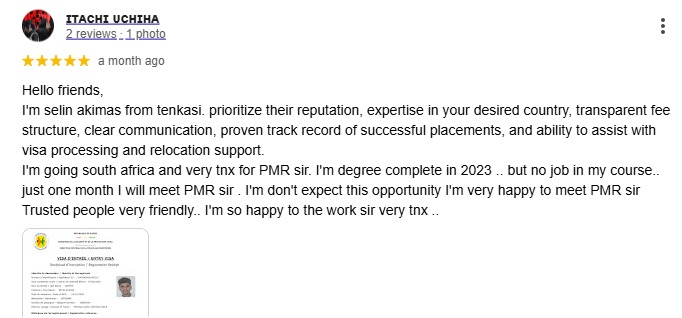 Hello friends, I'm selin akimas from tenkasi. prioritize their reputation, expertise in your desired country, transparent fee structure, clear communication, proven track record of successful placements, and ability to assist with visa processing and relocation support. I'm going south africa and very tnx for PMR sir. I'm degree complete in 2023 .. but no job in my course.. just one month I will meet PMR sir . I'm don't expect this opportunity I'm very happy to meet PMR sir Trusted people very friendly.. I'm so happy to the work sir very tnx ..