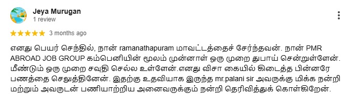 எனது பெயர் செந்தில், நான் ramanathapuram மாவட்டத்தைச் சேர்ந்தவன். நான் PMR ABROAD JOB GROUP கம்பெனியின் மூலம் முன்னாள் ஒரு முறை துபாய் சென்றுள்ளேன். மீண்டும் ஒரு முறை சவுதி செல்ல உள்ளேன்.எனது விசா கையில் கிடைத்த பின்னரே பணத்தை செலுத்தினேன். இதற்கு உதவியாக இருந்த mr.palani sir அவருக்கு மிக்க நன்றி மற்றும் அவருடன் பணியாற்றிய அனைவருக்கும் நன்றி தெரிவித்துக் கொள்கிறேன்.