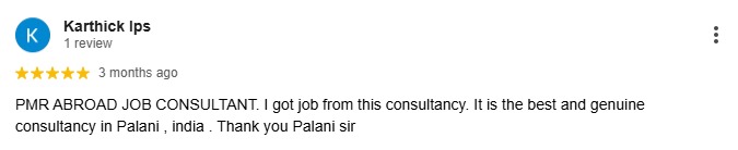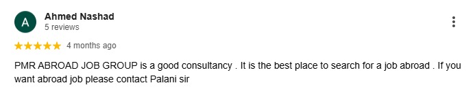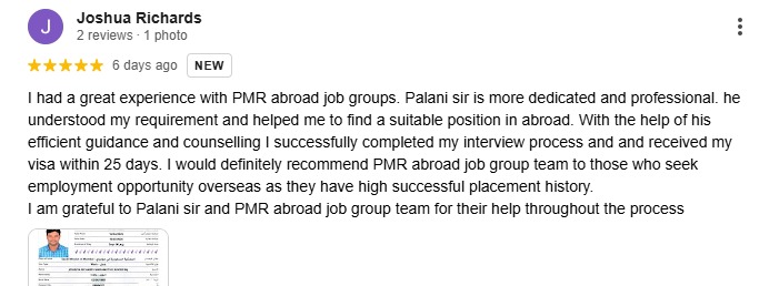 I had a great experience with PMR abroad job groups. Palani sir is more dedicated and professional. he understood my requirement and helped me to find a suitable position in abroad. With the help of his efficient guidance and counselling I successfully completed my interview process and and received my visa within 25 days. I would definitely recommend PMR abroad job group team to those who seek employment opportunity overseas as they have high successful placement history. I am grateful to Palani sir and PMR abroad job group team for their help throughout the process