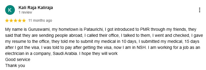 My name is Guruswami, my hometown is Pataurichi, I got introduced to PMR through my friends, they said that they are sending people abroad, I called their office, I talked to them, I went and checked, I gave my resume to the office, they told me to submit my medical in 10 days, I submitted my medical, 15 days after I got the visa, I was told to pay after getting the visa, now I am in NSH. I am working for a job as an electrician in a company, Saudi Arabia. I hope they will work Good service Thank you