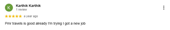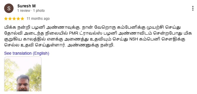 மிக்க நன்றி பழனி அண்ணாவுக்கு. நான் வேறொரு கம்பேனிக்கு முயற்சி செய்து தோல்வி அடைந்த நிலையில் PMR ட்ராவல்ஸ் பழனி அண்ணாவிடம் சென்றபோது மிக குறுகிய காலத்தில் எனக்கு அணைத்து உதவியும் செய்து NSH கம்பெனி சௌதிக்கு செல்ல உதவி செய்துள்ளார். அண்ணனுக்கு நன்றி.