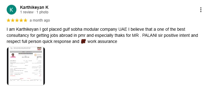 I am Karthikeyan I got placed gulf sobha modular company UAE I believe that a one of the best consultancy for getting jobs abroad in pmr and especially thaks for MR . PALANI sir positive intent and respect full person quick response and ? work assurance