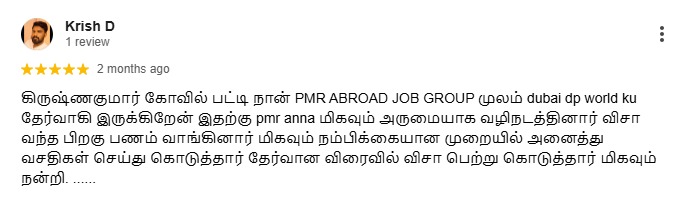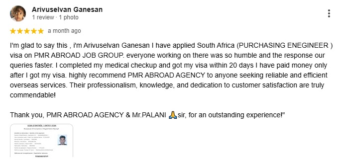I'm glad to say this , i'm Arivuselvan Ganesan I have applied South Africa (PURCHASING ENEGINEER ) visa on PMR ABROAD JOB GROUP. everyone working on there was so humble and the response our queries faster. I completed my medical checkup and got my visa within 20 days I have paid money only after I got my visa. highly recommend PMR ABROAD AGENCY to anyone seeking reliable and efficient overseas services. Their professionalism, knowledge, and dedication to customer satisfaction are truly commendable! Thank you, PMR ABROAD AGENCY & Mr.PALANI ?sir, for an outstanding experience!"