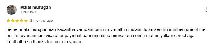 neme. malaimurugan nan kadantha varudam pmr niruvanathin mulam dubai sendru irunthen one of the best niruvanam fast visa ofter payment pannune intha niruvanam sonna mathiri yellam corect aga irunthathu so thanks for pmr niruvanam