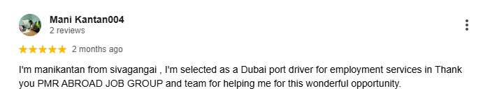 I'm manikantan from sivagangai , I'm selected as a Dubai port driver for employment services in Thank you PMR ABROAD JOB GROUP and team for helping me for this wonderful opportunity.