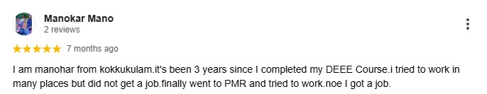 I am manohar from kokkukulam.it's been 3 years since I completed my DEEE Course.i tried to work in many places but did not get a job.finally went to PMR and tried to work.noe I got a job