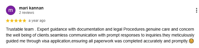 Trustable team . Expert guidance with documentation and legal Procedures.genuine care and concern the well being of clients.seamless communication with prompt responses to inquiries.they meticulously guided me through visa application,ensuring all paperwork was completed accurately and promptly.☺️