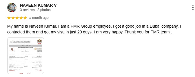 My name is Naveen Kumar, I am a PMR Group employee. I got a good job in a Dubai company. I contacted them and got my visa in just 20 days. I am very happy. Thank you for PMR team .