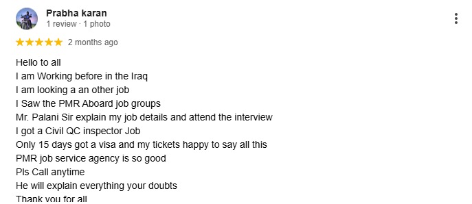Hello everyone I was working in Iraq before I was looking for another job I saw PMR in job group Mr. Palani sir, he told me the details about my job interview and how I should attend the interview. I gave my hard work and through that I easily got the job of Civil QC Inspector. I am happy to say that I got the visa and tickets within 15 days PMR job service company is very good Call anytime He will clarify your doubts