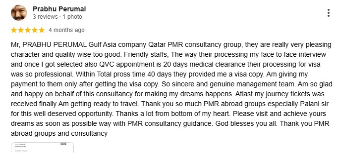 Mr, PRABHU PERUMAL Gulf Asia company Qatar PMR consultancy group, they are really very pleasing character and quality wise too good. Friendly staffs, The way their processing my face to face interview and once I got selected also QVC appointment is 20 days medical clearance their processing for visa was so professional. Within Total pross time 40 days they provided me a visa copy. Am giving my payment to them only after getting the visa copy. So sincere and genuine management team. Am so glad and happy on behalf of this consultancy for making my dreams happens. Atlast my journey tickets was received finally Am getting ready to travel. Thank you so much PMR abroad groups especially Palani sir for this well deserved opportunity. Thanks a lot from bottom of my heart. Please visit and achieve yours dreams as soon as possible way with PMR consultancy guidance. God blesses you all. Thank you PMR abroad groups and consultancy