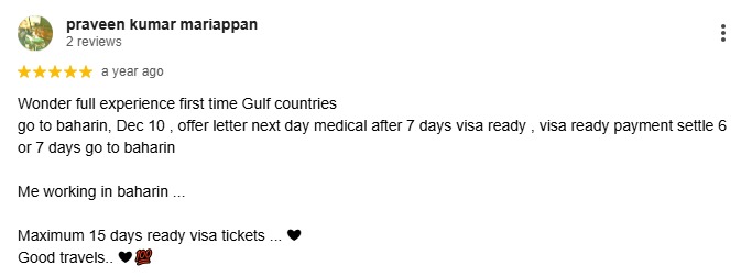 Wonder full experience first time Gulf countries go to baharin, Dec 10 , offer letter next day medical after 7 days visa ready , visa ready payment settle 6 or 7 days go to baharin Me working in baharin ... Maximum 15 days ready visa tickets ... ❤ Good travels.. ❤?