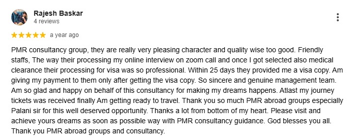 PMR consultancy group, they are really very pleasing character and quality wise too good. Friendly staffs, The way their processing my online interview on zoom call and once I got selected also medical clearance their processing for visa was so professional. Within 25 days they provided me a visa copy. Am giving my payment to them only after getting the visa copy. So sincere and genuine management team. Am so glad and happy on behalf of this consultancy for making my dreams happens. Atlast my journey tickets was received finally Am getting ready to travel. Thank you so much PMR abroad groups especially Palani sir for this well deserved opportunity. Thanks a lot from bottom of my heart. Please visit and achieve yours dreams as soon as possible way with PMR consultancy guidance. God blesses you all. Thank you PMR abroad groups and consultancy.