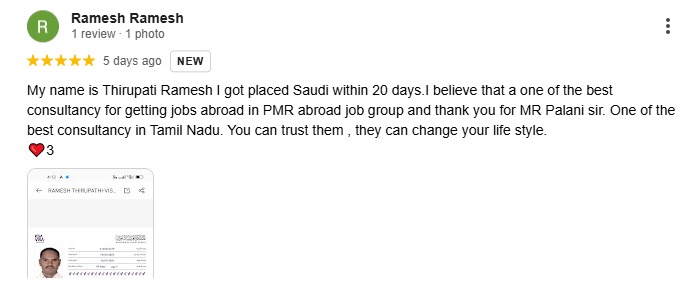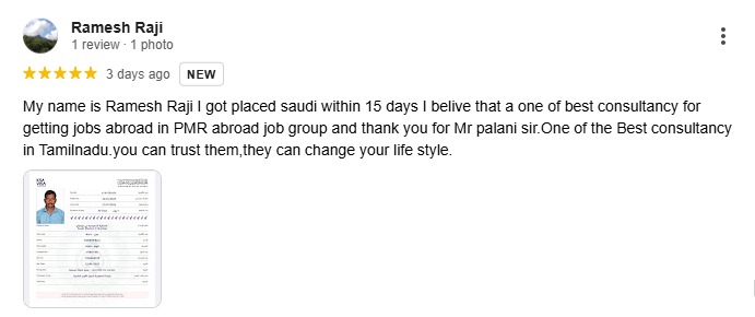 My name is Ramesh Raji I got placed saudi within 15 days I belive that a one of best consultancy for getting jobs abroad in PMR abroad job group and thank you for Mr palani sir.One of the Best consultancy in Tamilnadu.you can trust them,they can change your life style.