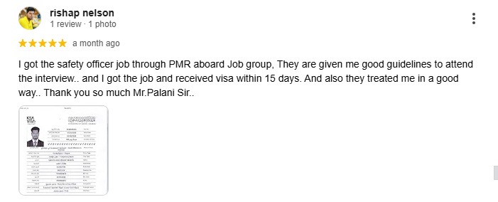I got the safety officer job through PMR aboard Job group, They are given me good guidelines to attend the interview.. and I got the job and received visa within 15 days. And also they treated me in a good way.. Thank you so much Mr.Palani Sir..