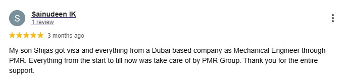 My son Shijas got visa and everything from a Dubai based company as Mechanical Engineer through PMR. Everything from the start to till now was take care of by PMR Group. Thank you for the entire support.