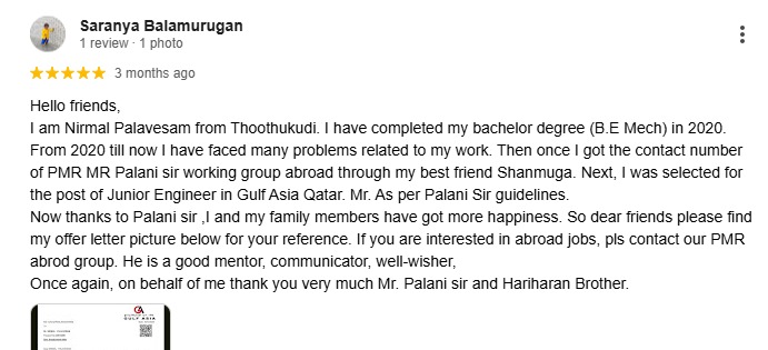 Hello friends, I am Nirmal Palavesam from Thoothukudi. I have completed my bachelor degree (B.E Mech) in 2020. From 2020 till now I have faced many problems related to my work. Then once I got the contact number of PMR MR Palani sir working group abroad through my best friend Shanmuga. Next, I was selected for the post of Junior Engineer in Gulf Asia Qatar. Mr. As per Palani Sir guidelines. Now thanks to Palani sir ,I and my family members have got more happiness. So dear friends please find my offer letter picture below for your reference. If you are interested in abroad jobs, pls contact our PMR abrod group. He is a good mentor, communicator, well-wisher, Once again, on behalf of me thank you very much Mr. Palani sir and Hariharan Brother.