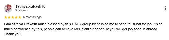 I am sathiya Prakash much blessed by this P.M.R group.by helping me to send to Dubai for job. It's so much confidence by this, people can believe Mr.Palani sir hopefully you will get job soon in abroad. Thank you.