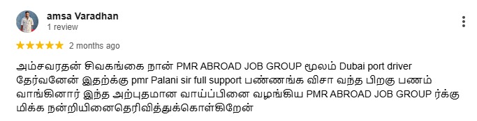 அம்சவரதன் சிவகங்கை நான் PMR ABROAD JOB GROUP மூலம் Dubai port driver தேர்வனேன் இதற்க்கு pmr Palani sir full support பண்ணங்க விசா வந்த பிறகு பணம் வாங்கினார் இந்த அற்புதமான வாய்ப்பினை வழங்கிய PMR ABROAD JOB GROUP ர்க்கு மிக்க நன்றியினைதெரிவித்துக்கொள்கிறேன்