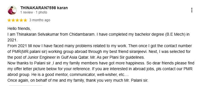Hello friends, I am Thinakaran Selvakumar from Chidambaram. I have completed my bachelor degree (B.E Mech) in 2021. From 2021 till now I have faced many problems related to my work. Then once I got the contact number of PMR(MR.palani sir) working group abroad through my best friend siranjeevi. Next, I was selected for the post of Junior Engineer in Gulf Asia Qatar. Mr. As per Plani Sir guidelines. Now thanks to Palani sir ,I and my family members have got more happiness. So dear friends please find my offer letter picture below for your reference. If you are interested in abroad jobs, pls contact our PMR abrod group. He is a good mentor, communicator, well-wisher, etc.... Once again, on behalf of me and my family, thank you very much Mr. Palani sir.