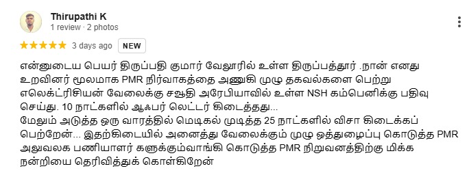 என்னுடைய பெயர் திருப்பதி குமார் வேலூரில் உள்ள திருப்பத்தூர் .நான் எனது உறவினர் மூலமாக PMR நிர்வாகத்தை அணுகி முழு தகவல்களை பெற்று எலெக்ட்ரிசியன் வேலைக்கு சவூதி அரேபியாவில் உள்ள NSH கம்பெனிக்கு பதிவு செய்து. 10 நாட்களில் ஆஃபர் லெட்டர் கிடைத்தது... மேலும் அடுத்த ஒரு வாரத்தில் மெடிகல் முடித்த 25 நாட்களில் விசா கிடைக்கப் பெற்றேன்... இதற்கிடையில் அனைத்து வேலைக்கும் முழு ஒத்துழைப்பு கொடுத்த PMR அலுவலக பணியாளர் களுக்கும்வாங்கி கொடுத்த PMR நிறுவனத்திற்கு மிக்க நன்றியை தெரிவித்துக் கொள்கிறேன்