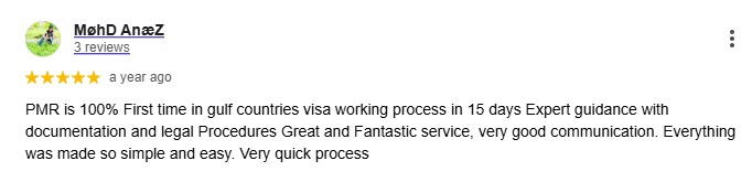 PMR is 100% First time in gulf countries visa working process in 15 days Expert guidance with documentation and legal Procedures Great and Fantastic service, very good communication. Everything was made so simple and easy. Very quick process