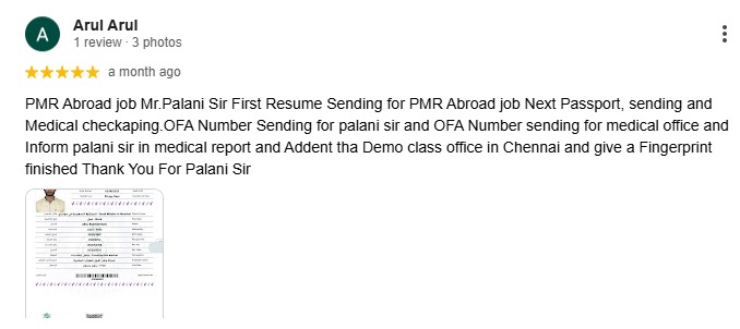 PMR Abroad job Mr.Palani Sir First Resume Sending for PMR Abroad job Next Passport, sending and Medical checkaping.OFA Number Sending for palani sir and OFA Number sending for medical office and Inform palani sir in medical report and Addent tha Demo class office in Chennai and give a Fingerprint finished Thank You For Palani Sir
